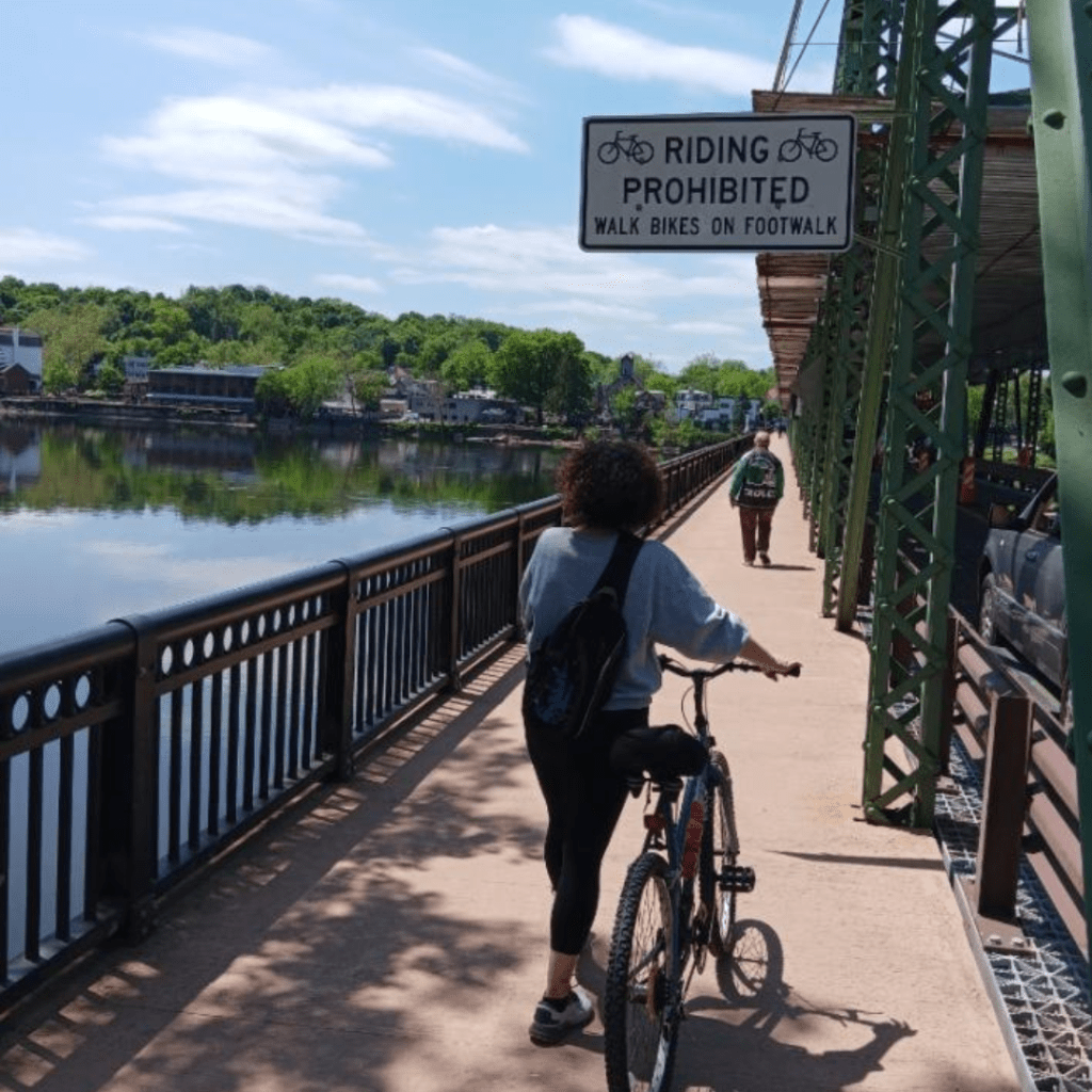 The trail was easy and accessible. The challenge was the distance, not the trail itself. No steep, get off your butt and push those pedal moments. The fun of being in New Jersey one moment, riding into Pennsylvania, and walking across bridges was uber-cool.